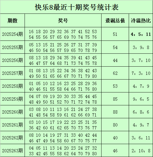 福彩兴隆8第2025263期开奖回来:04 05 11 13 14 20 23 24 27 32 33 42 45 55 58 62 64 70 79 80,其中冷温热码比为1:8:11,遗漏总值为46。